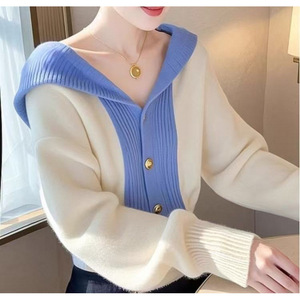 秋冬宽松长袖毛衣针织开衫外套女2025新款设计感拼色长袖连帽上衣