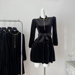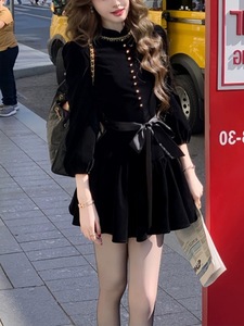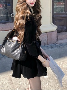 【伯拉德千金 新品88折】赫本风黑色丝绒长袖连衣裙秋季