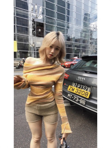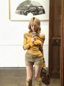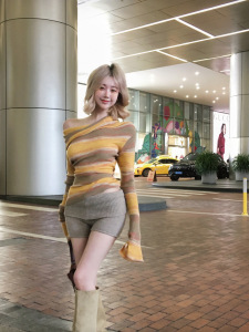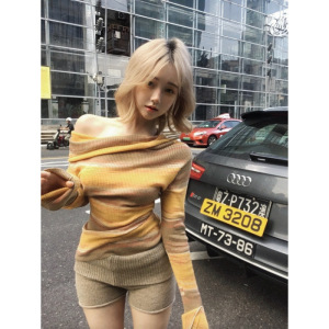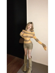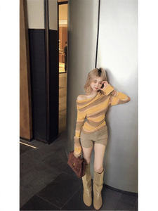 秋季甜辣妹斜领一字肩条纹撞色打底衫时尚气质纯欲风修身显瘦上衣