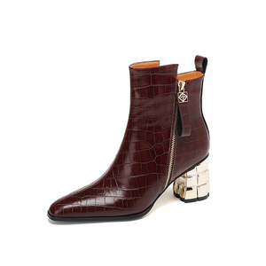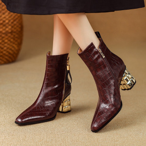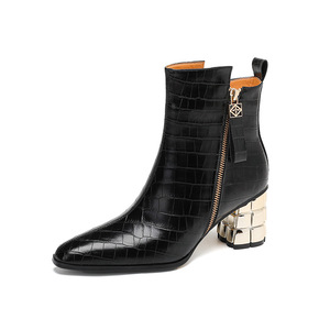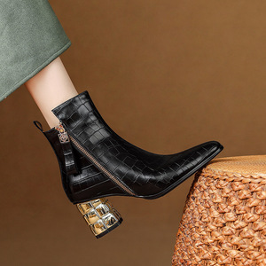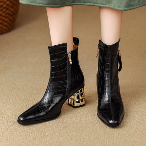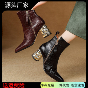 时尚真皮高跟女靴子2025秋冬新款尖头粗跟斜拉链马丁靴百搭时装靴