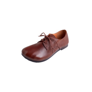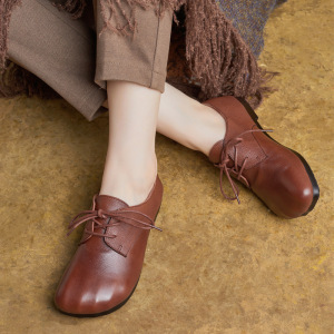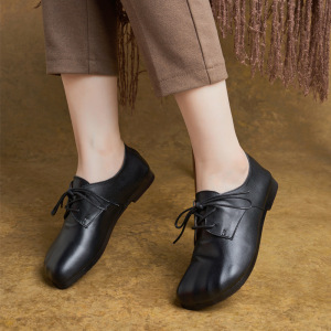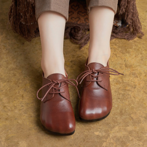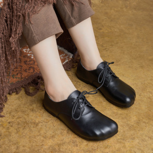 2025秋季新款真皮英伦风方头系带软皮手工浅口女鞋平底单鞋小皮鞋