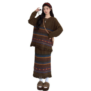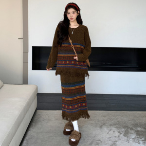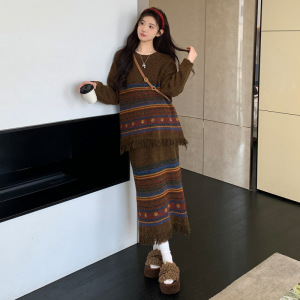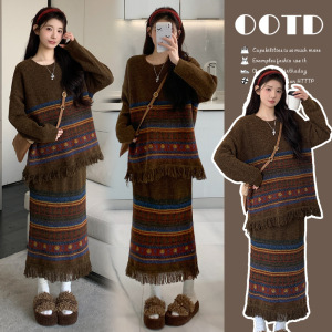 孕妇秋冬时尚新款条纹毛衣+针织半身裙法式甜美显瘦流苏边两件套