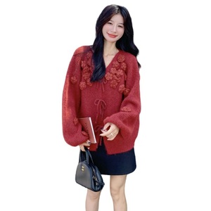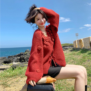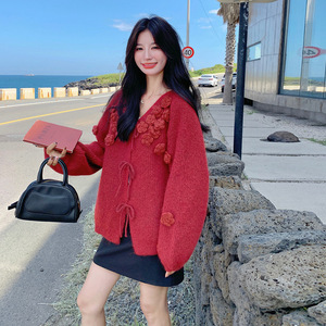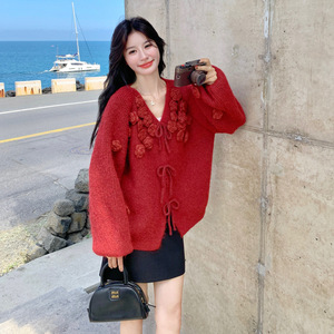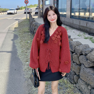 红色可盐可甜减龄花朵毛衣针织开衫套装女秋新款小个子显瘦短外套
