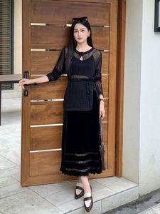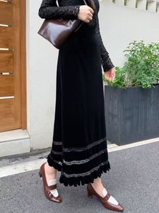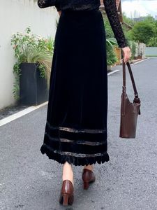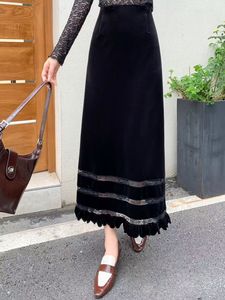 欧洲站2025秋季新款松紧高腰镂空蕾丝花边洋气长款丝绒半身裙鱼尾