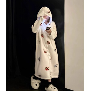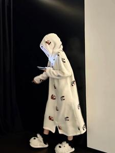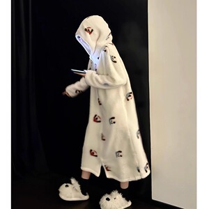 甜美可爱卡通印花珊瑚绒睡袍女款冬季加绒加厚保暖连帽家居服睡衣