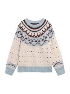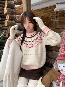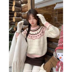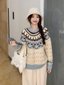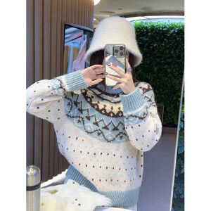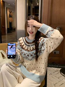 复古提花撞色加厚保暖长袖毛衣女2025冬季新款宽松外穿针织衫上衣