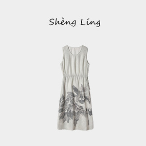 100%汉麻连衣裙圆领国风新中式水墨画印花女SL50543