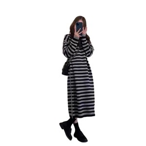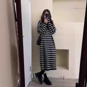欧洲站秋冬2025新款女装长款过膝宽松条纹毛衣裙子针织连衣裙打底