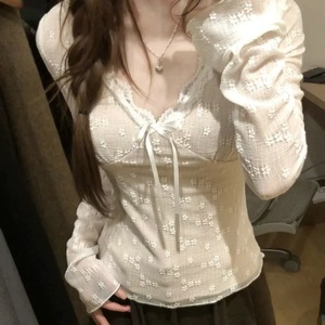 法式别致V领蕾丝边长袖T恤女秋季bm风蝴蝶结修身显瘦内搭短款上衣
