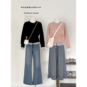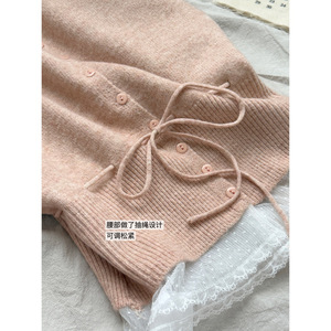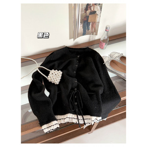 塞纳韩系抽绳蕾丝花边纯色针织开衫女早秋新款百搭毛衣外套上衣
