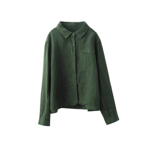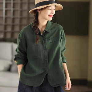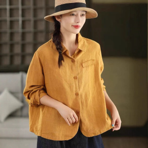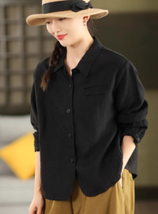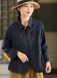 秋季新款 敦实亚麻衬衫翻领长袖衬衣宽松纯色上衣9608