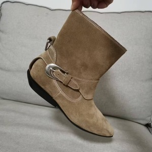 牛皮版~复古尖头西部牛仔靴短靴女秋冬新款加绒低跟马丁靴瘦瘦靴