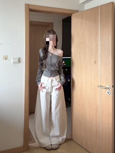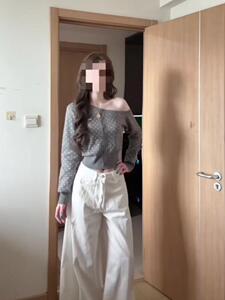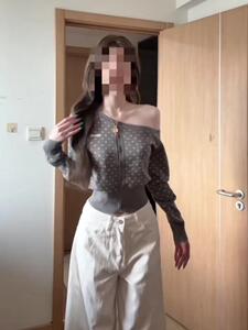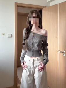 韩系灰色波点长袖针织开衫女早秋季辣妹修身显瘦内搭斜领露肩上衣