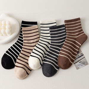 秋季咖色系条纹袜子巴恩风女中筒袜透气吸汗棉袜简约百搭现货批发
