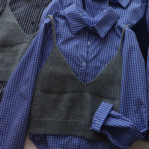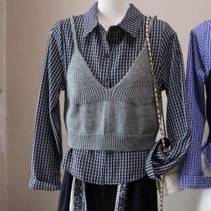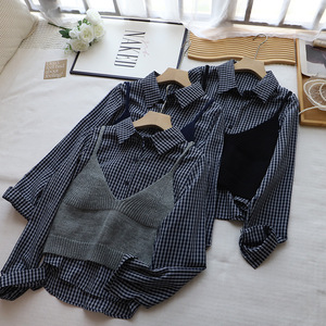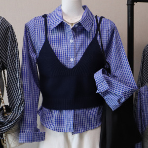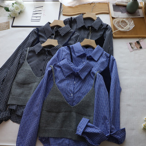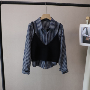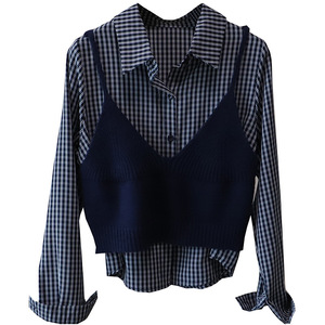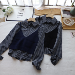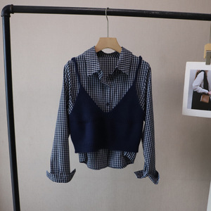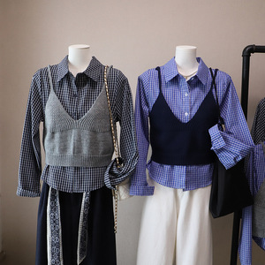 [比正]2025秋季新款韩版小个子格子衬衫针织马甲背心两件套女5020