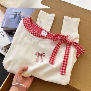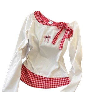 拼色格子假两件长袖T恤女早春新款韩系设计感超好看独特漂亮上衣