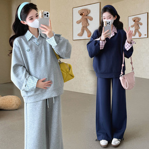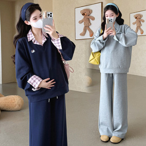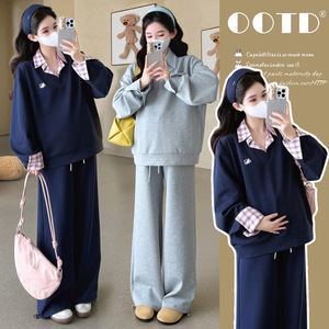 2025秋冬新款假两件卫衣格子拼接polo领小众设计百搭休闲孕妇套装