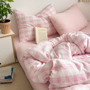 A类云感纯双层纱棉床上四件套格子格纹皱皱纱被套床品床单三件套8