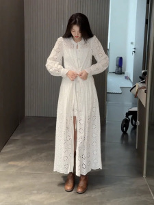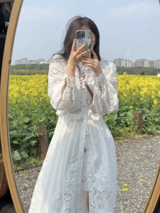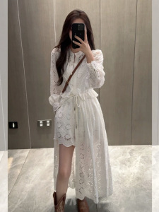2025春季新款女设计感小众镂空白色蕾丝裙法式重工长袖连衣裙套装