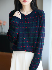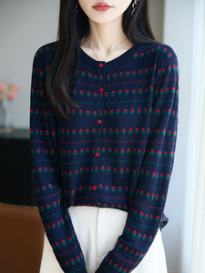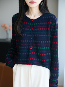 2025年早秋新款精纺羊毛圆领针织开衫长袖女提花宽松百搭上衣外套