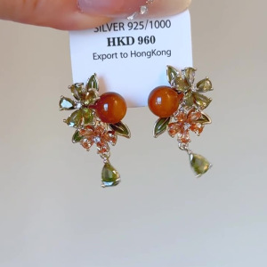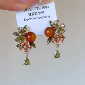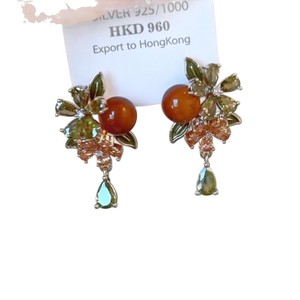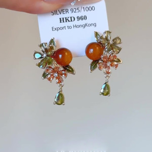 新中式精致设计感显白气质耳饰琥珀花语森系甜美满钻花朵耳钉