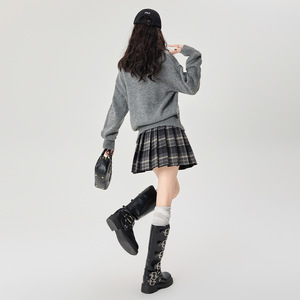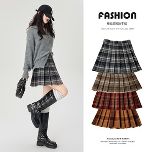 呢子格子半身裙女2025秋冬季复古高腰显瘦百褶裙学院风A字短裙潮
