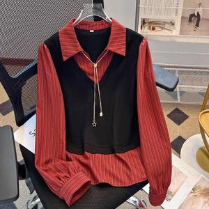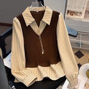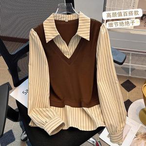 假两件套长袖条纹衬衫马甲女秋秋设计感小众洋气显瘦Polo领上衣