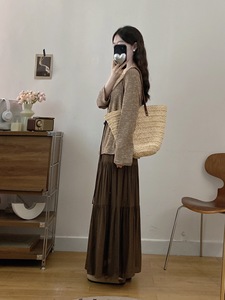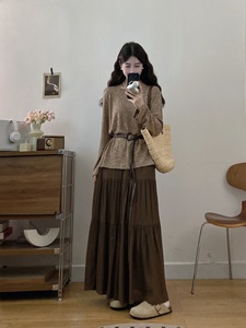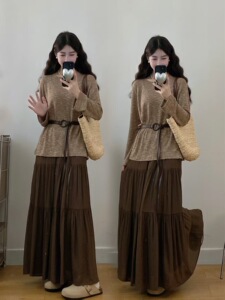 2025年新款卢浮画展出街心头爱秋季叠穿感套装圆领上衣+半身裙