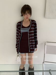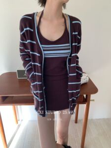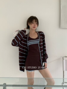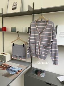 CXI 复古撞色条纹针织长袖外套吊带背心针织半身短裙秋季三件套装