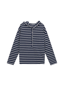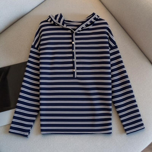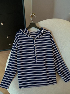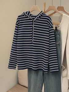 藏青色条纹套头连帽卫衣女早秋季2025新款宽松慵懒风长袖t恤上衣