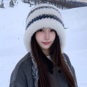 米色 条纹加厚款 双辫撞色辫子 手工流苏绑带帽子(网红爆款户外美式日系复古ins风滑雪头套北欧风多彩