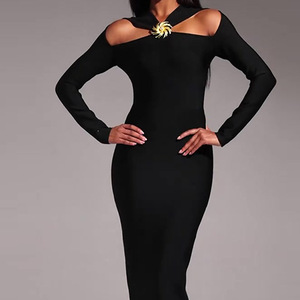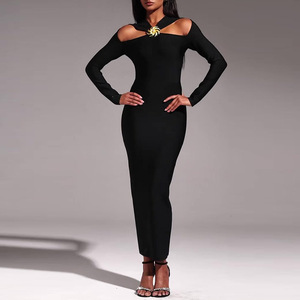 2025年秋新款欧美亚马逊跨境外贸女装气质优雅纯黑色收腰修身长裙
