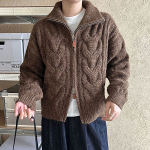 慵懒风翻领麻花毛衣外套女秋冬新款韩系宽松拉链加厚针织开衫上衣