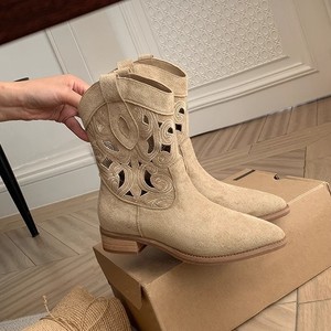 现货~羊皮版葡萄妈同款鞋辣妹尖头镂空刺绣中筒短筒粗跟西部靴女