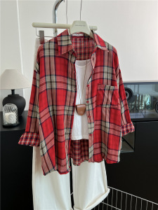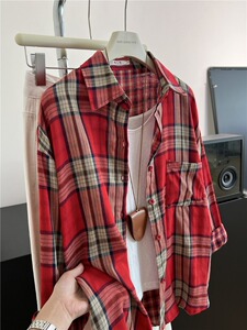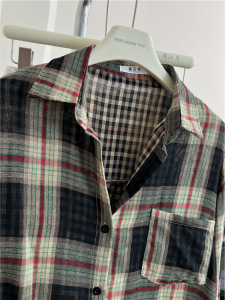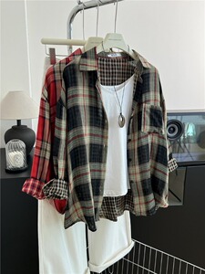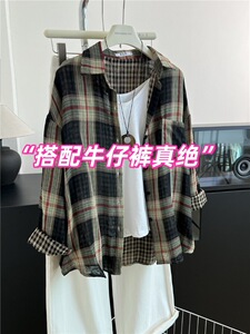 黑色格子衬衫双面棉纱格子秋季韩版宽松叠穿复古衬衣薄外套A7060