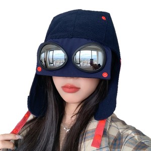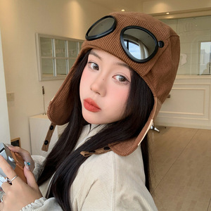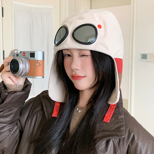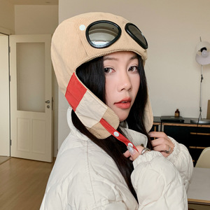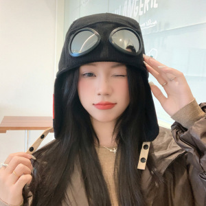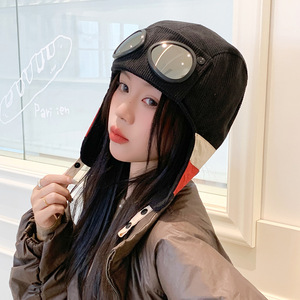 日系新款秋冬季帽子女加绒保暖帽护目镜飞行帽百搭防风护耳雷锋帽