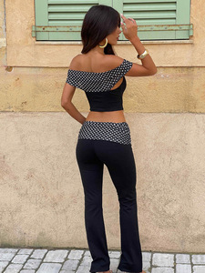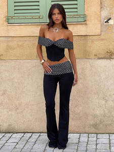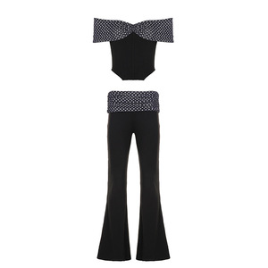 辣妹风翻腰波点拼接时尚套装女跨境一字肩收腰胸衣+微喇低腰针织