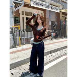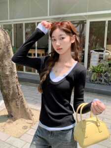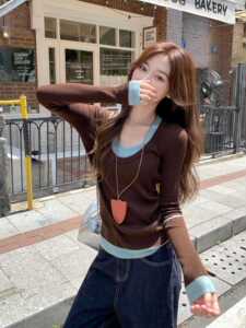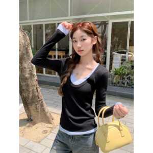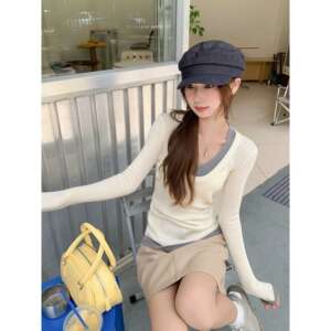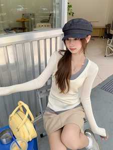 假两件复古撞色长袖针织衫秋冬新款chic别致辣妹内搭上衣女打底衫