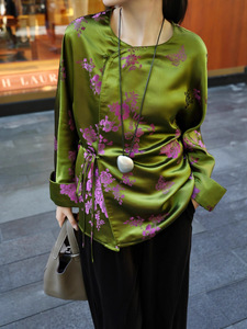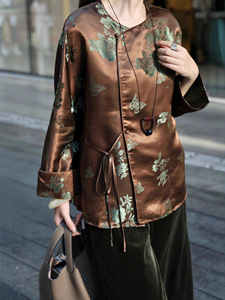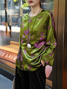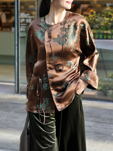 双色桑蚕丝人丝老缎复古国风提花圆领斜襟盘扣系带秋季唐装上衣