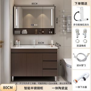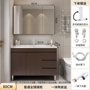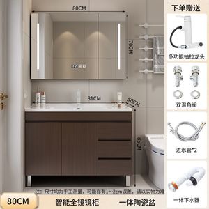 胡桃木落地柜+智能全封镜柜-80CM+陶瓷一体盆+白抽拉上出水龙头