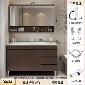 胡桃木落地柜+智能全封镜柜-90CM+陶瓷一体盆+白抽拉上出水龙头