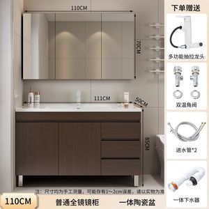 胡桃木落地柜+智能全封镜柜-110CM+陶瓷一体盆+白抽拉上出水龙头