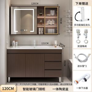 胡桃木落地柜+智能全封镜柜-120CM+陶瓷一体盆+白抽拉上出水龙头