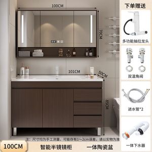 胡桃木落地柜+智能全封镜柜-100CM+陶瓷一体盆+白抽拉上出水龙头