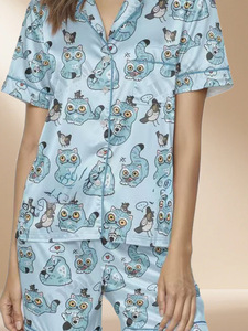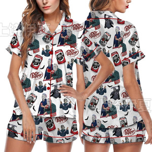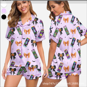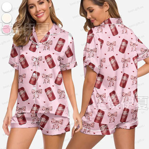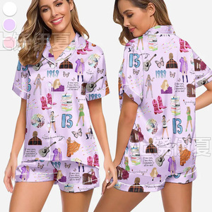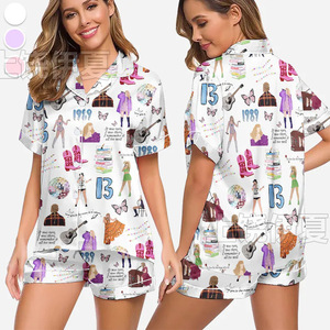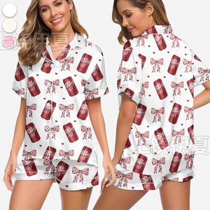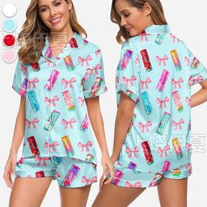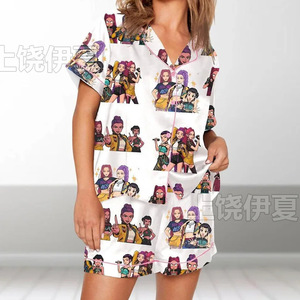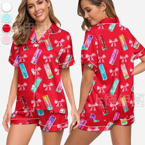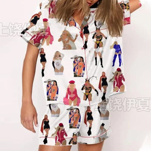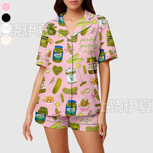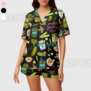 伊夏跨境热销定 制休闲女士睡衣印花翻领短袖短裤欧美
