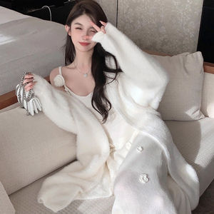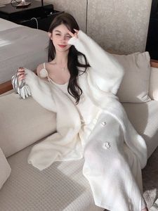 早秋秋冬穿搭温柔风白色名媛吊带连衣裙长款显瘦毛衣裙套装两件套