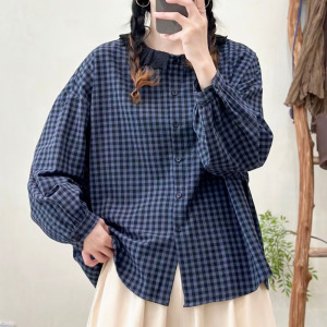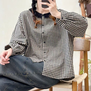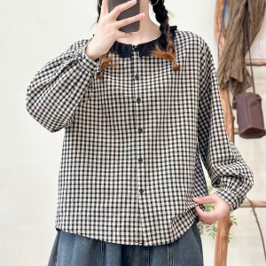 森系花边领休闲格子衬衣女减龄文艺棉质长袖上衣宽松百搭厚料衬衫