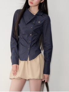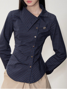 深藏青斜翻领复古格纹掐腰显瘦长袖衬衫上衣女