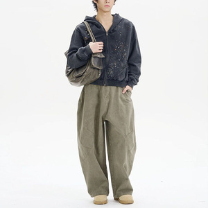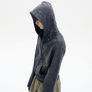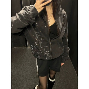 满天星烫钻水洗做旧连帽卫衣男女秋冬季设计宽松显瘦拉链开衫外套