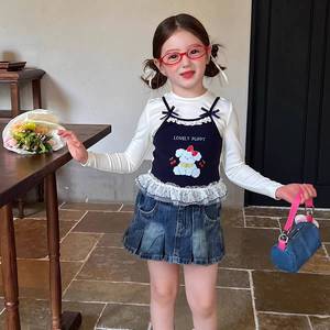 柠里女童装韩版秋季假两件T恤秋季新款儿童宝宝荷叶边长袖上衣潮